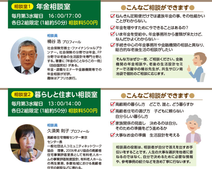老後の生活設計を支える「お金」と「すまい」。年金事務所でも、金融機関でも、不動産会社でもなく、誰に相談したらいいのかわからないような総合的な生活相談や、いまさら人に聞けないような年金制度の基礎知識まで、完全個別でご相談に応じます。もし身近に不安やお悩みを抱えている方がいらしたら、ぜひ<共生サロン南池袋>のワンコイン(500円)相談会を教えて差し上げてください。