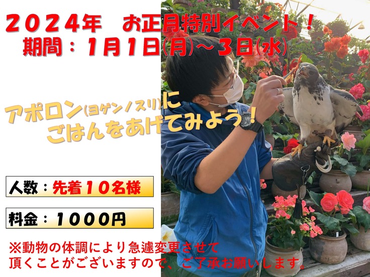富士花鳥園のお正月特別イベントは、「ヨゲンノスリのアポロンにごはんをあげてみよう!」です。