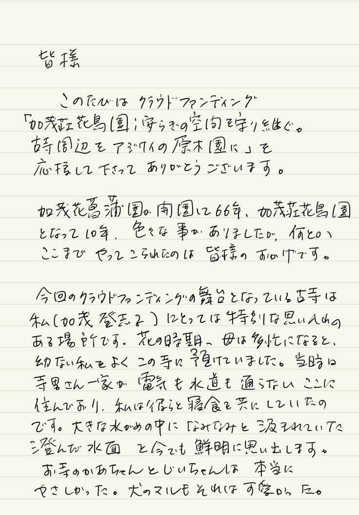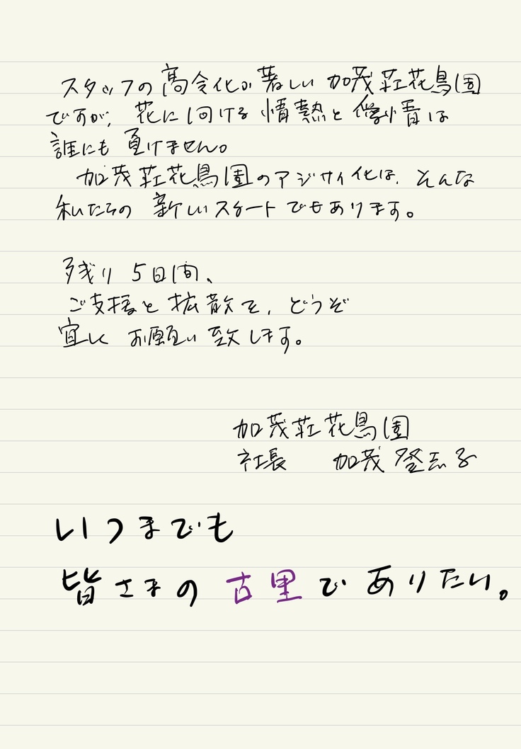 加茂荘花鳥園のプロジェクトが残り5日となり、社長メッセージを書きました。