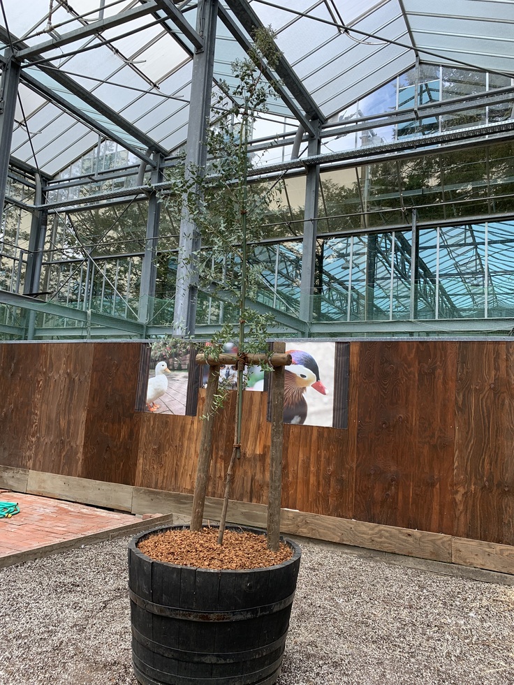 4月26日、待望のシンボルツリー2本が南の鳥ふれあいエリアに納入されました。向かって左がアカシア、右がユーカリです。遠目だとわかりにくいですが、樹高はどちらも3m程度です。