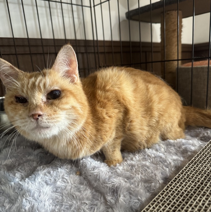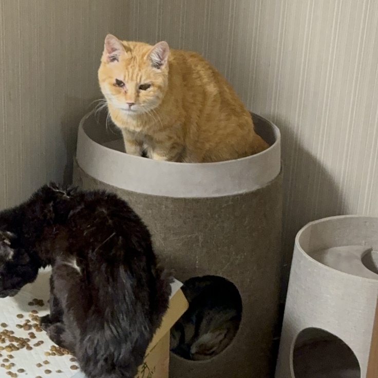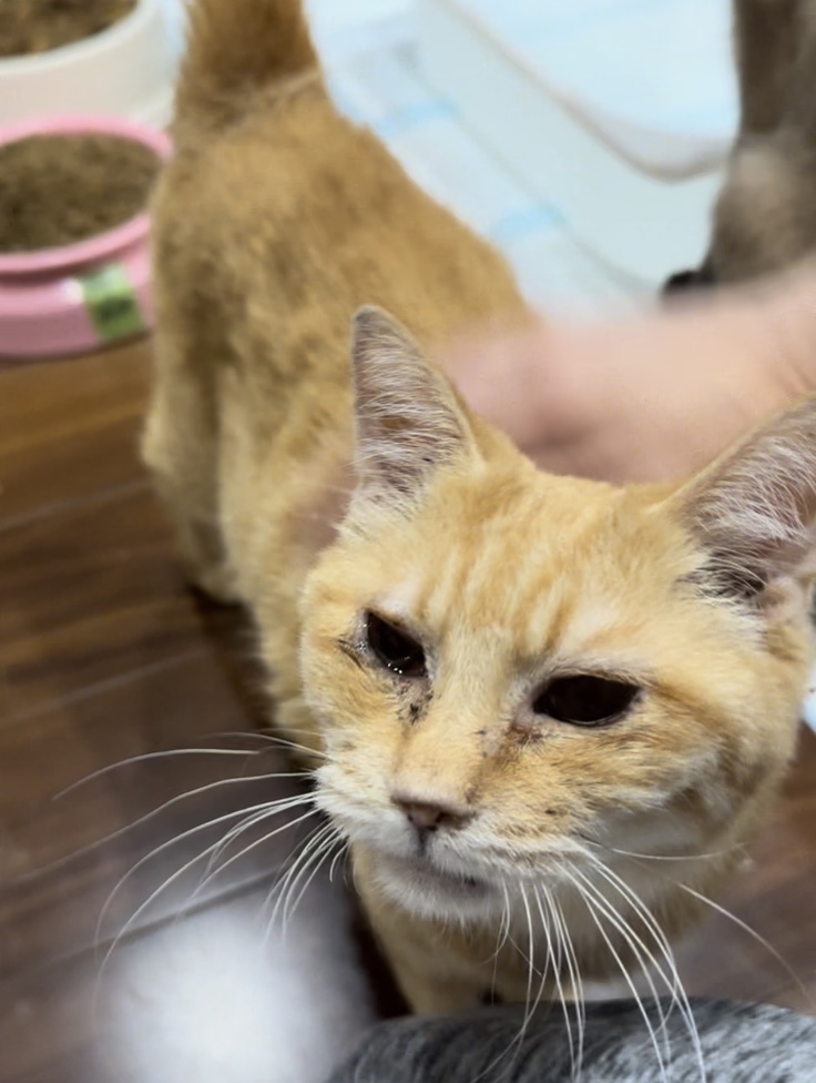 目の結膜炎は慢性化しており、再発して涙目になることが多いのですが、ねこひげハウスの仲間たちと過ごしています。