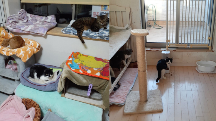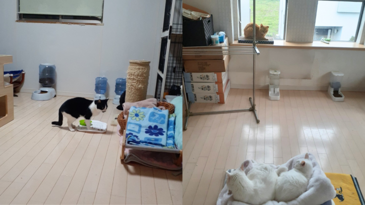 チームZEROシェルターでは、当初より部屋分けされておりましたので、そのまま管理を継続させていただいております。猫部屋として4部屋あり、私たちが管理しやすいように、配置や食器を変更したり、清掃道具を揃えたりいたしました。
