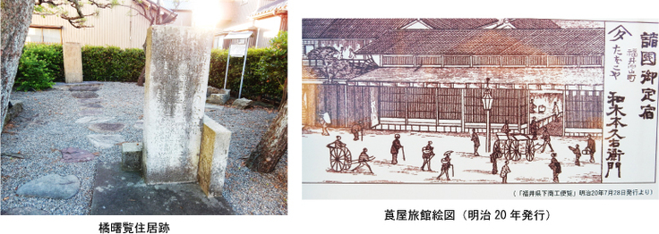 また近くには、幕末期の歌人、国学者で身近な言葉「たのしみは~」で始まる日常生活を詠んだ和歌「独楽吟」で知られる橘曙覧(たちばなのあけみ)の住居があった藁屋(わらや)跡。