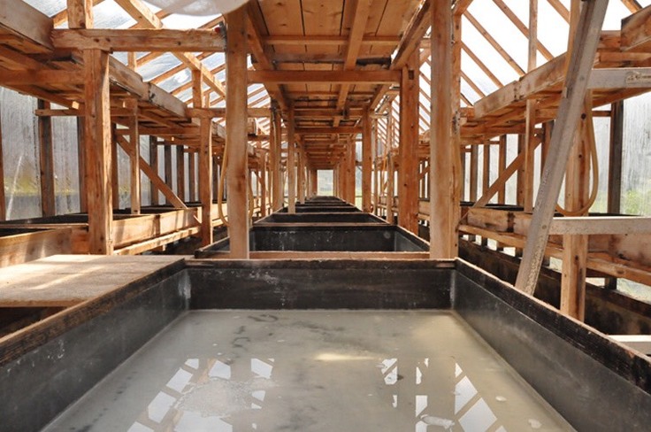海辺で作るのと比べると、同じ季節なら、3倍ぐらい時間が掛かる。夏場で2〜3週間、冬場で2〜3ヵ月。効率は悪いが時間をかけてできあがった塩には、カルシウムなどの海水中のミネラル分も取り込まれまれるようで、カルシウムやマグネシウムをそれだけ食べてもうまいというわけではないが、それらが少しずつ混じり合っていることで、塩の味に深みやまろやかさが出る。イオン交換膜で作った、純度の高い塩化ナトリウム(NaCl)と比べると、味の違いはすぐにわかると思う。