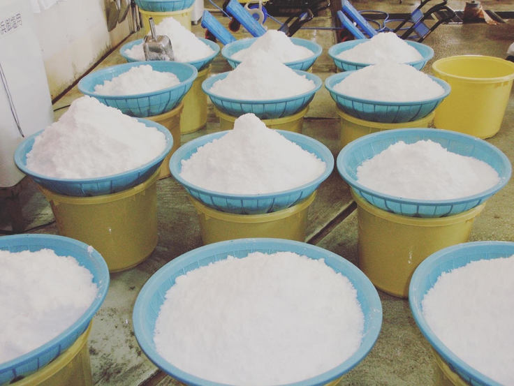 今回の塩選び、いろいろな候補塩を味見。何人かにもブラインドテストで味を見てもらうとかなりの確率でこの塩が美味しいという結果。平釜式といってもほとんどが二釜式なのに対してここは一釜式で製造しているので、カルシウムが多く含まれている。そのせいか、かどがなく味がとてもまろやかに感じ、これで梅を漬けると美味しそうと皆。甘み・旨みも十分感じるまさに和食に合う日本の塩。