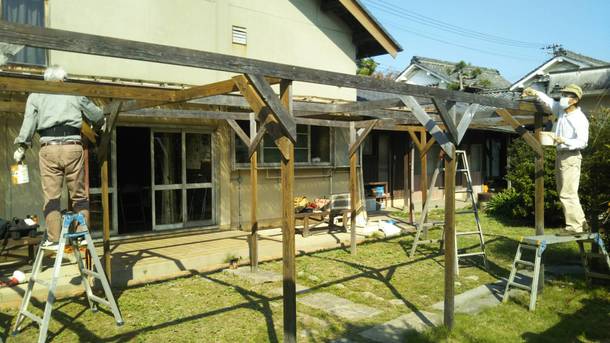 今日は朝からボランティアの男性2人で腐蝕予防のペンキ塗りです。