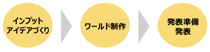 廃校とは何か、数や理由など社会課題背景、活用事例を学びます。次にアイデアの作り方を学び、5人/グループで制作するものを決め、役割分担をしてワールドを作ります。最後にワールドの紹介方法を話し合い、グループごとに発表します。