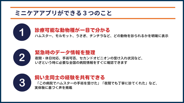 「こういうアプリをずっと探していました」 「引っ越し先でも、すぐに病院が見つけられて安心しました」 「ハムスターを診てくれる病院が一目で分かって助かりました」