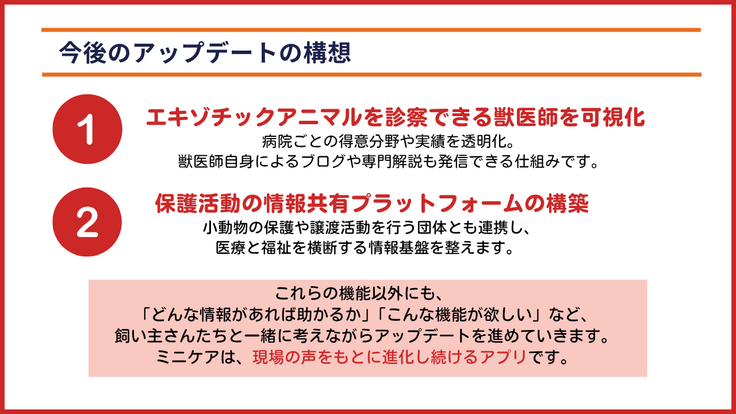 飼い主が日々の様子を“見える化”し、獣医師と一緒に健康を守る。ミニケアは、そんな“小さな命の見守るパートナー”として進化していきます。