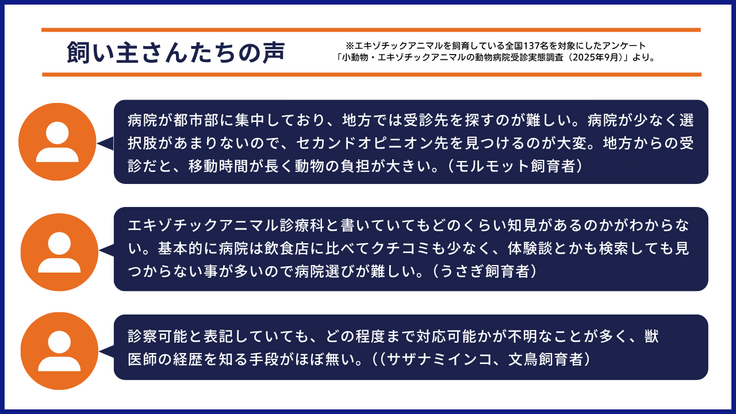 アンケートでは、アルマジロやキンカジューといった珍しい家族の医療情報を探している飼い主さんの声も寄せられました。