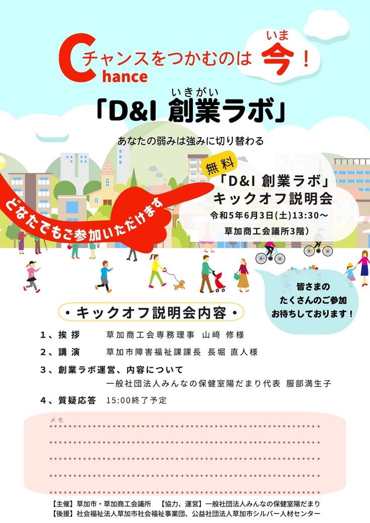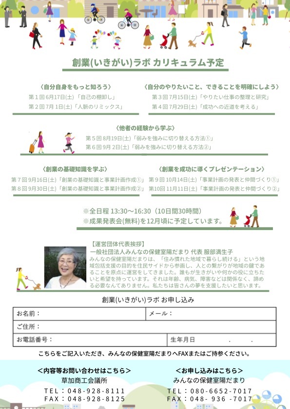 また、6月から草加商工会主催の創業(いきがい)ラボをみんなの保健室陽だまりで運営することとなりました。