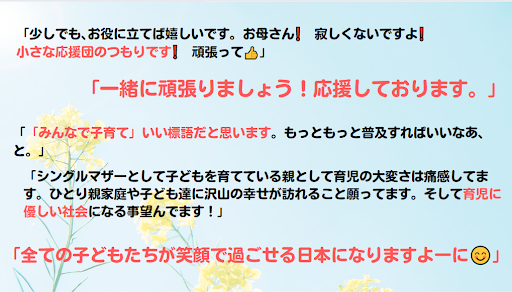 寄付者の皆さんからは、プロジェクトへの応援メッセージだけでなく、困難な状況にある親子へのエールや、「日本がこんな社会になって欲しい」という願いも多くお寄せいただきました。