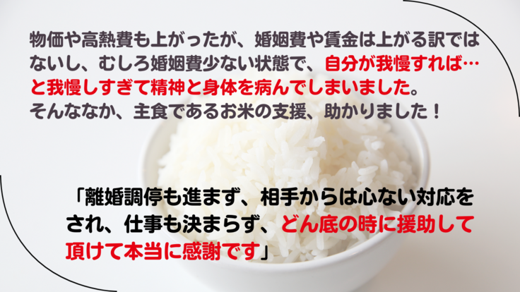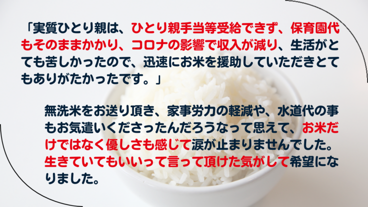この緊急支援でお米を届けたご家庭から届いた声の一部をご紹介します。