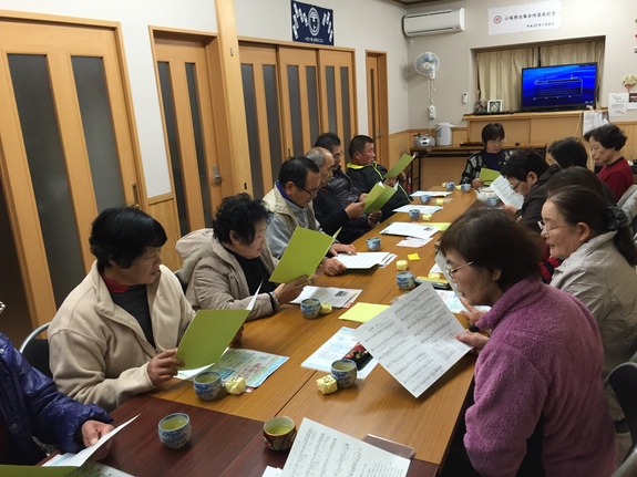 この写真は、名取市小塚原北町内会有志合唱団の皆さんの練習風景です。