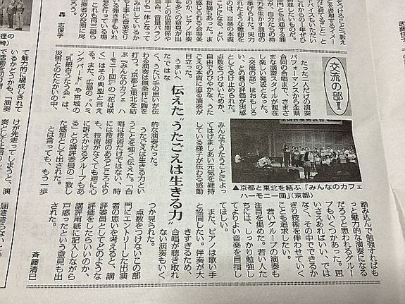 新聞の4ページ、5ページには「合唱発表会、オリジナルコンサートの総評」が掲載されており、私たち「京都と東北を結ぶみんなのカフェハーモニー団」が出場した「交流の部Ⅱ」の総評では、私たちの事が写真入りで掲載されていました。