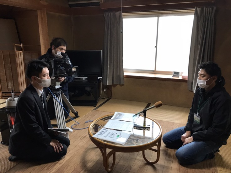 地元の方とメディア向けに開催した内覧会の1コマ。内覧会で取材を受ける代表理事。3つのメディアに取材していただきました。