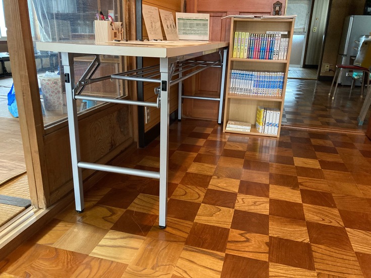 カラーボックス、長机をいただき、本棚と受付場所ができあがりました。