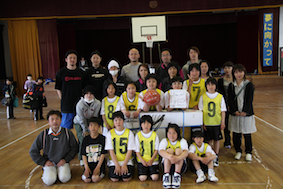 また、石巻市内の体育館を使う機会を頂いた際には、プロバスケットボールの選手たちと一緒になって、石巻・女川のバスケットボールチームの子どもたちと思い切りバスケットボールをして、汗を流しました。