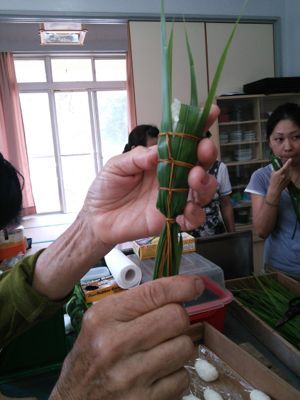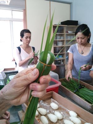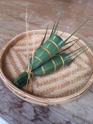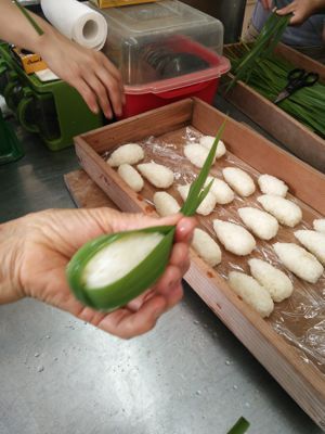 ガヤマキは蒸したもち米をガヤに包んだものです