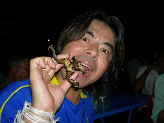 ラオスでの食事は、もち米が主食です。小ぶりの竹筒にはいったもち米を、お寿司のシャリほどの量をとって、手で握って固めて食べます。それだけだと味がないので、野菜(名前はわからない)やちょっと辛い香辛料と一緒に食します。ただ、たんぱく質が不足するので、カエルやコオロギも食卓にのぼります。カエルは鶏肉のような味、コオロギは油で揚げてあって、海老のような味がします(足がちょっとひっかかりますが・・・)。もし食べられない場合でも、こどもたちが食べてくれるので残すことは失礼になりません。