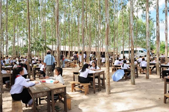 ポントゥン村に到着した私たちは、村や学校をしばし探索したのち、いよいよ図画工作のワークショップを始めることになります。学校の校庭には、まるでリゾート地のような木立。それを見ていた日比野さんが急に「よし、外でやろう。みんなに机と椅子を校庭に出してもらおう」、それが青空ワークショップの始まりでした。校庭に立ち並ぶ木立、実は景観を良くするためではなく、いずれはこれを伐採し、少しでも学校運営の足しにするためなのです。