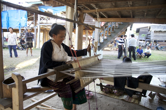 ポントゥン村では、織物が盛んです。実際に、水彩画のワークショップ終了後に、村人たちの織物をしている様子を見せていただきました。また、村に到着した時に、歓迎のあいさつとしてスカーフを、参加者すべての首に巻いてくださいました。