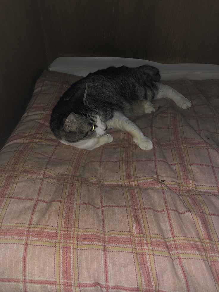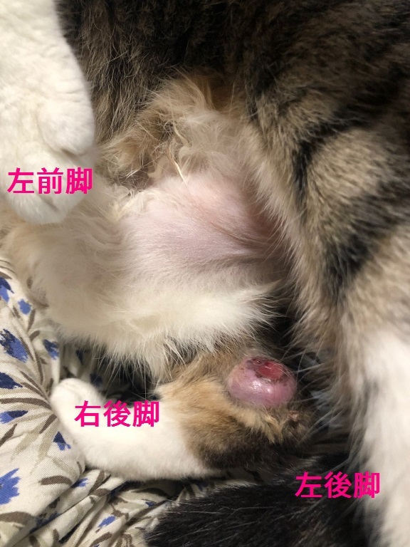 シーツに脚の傷の血が付着し本当に痛々しいですが、ここがお気に入りなので、ここで優しくブラッシングをしたり撫で撫でしたりしています。