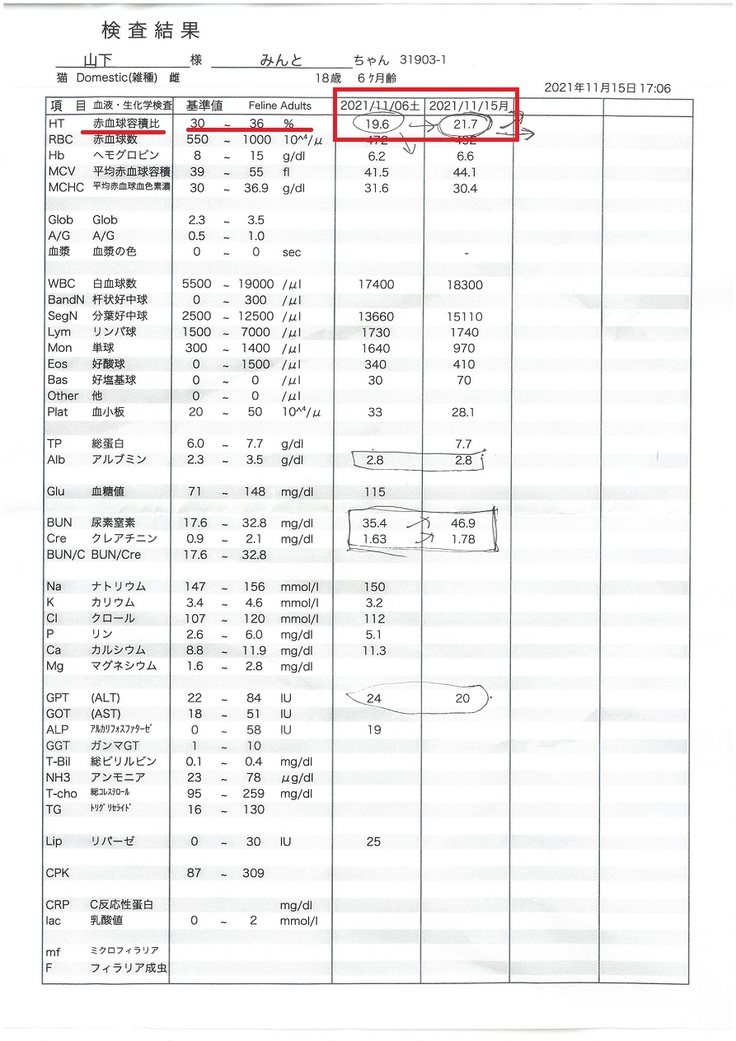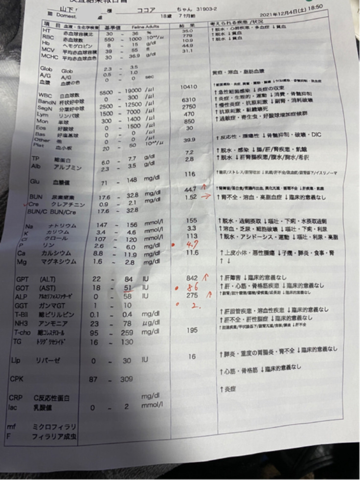 また、先日の血液検査の結果で腎数値が少し悪くてもそんなに深刻に考えていなかったのですが、猫の血液検査に腎臓の異常値が出ている時点で腎臓がかなり悪いとのお話をいただきました。