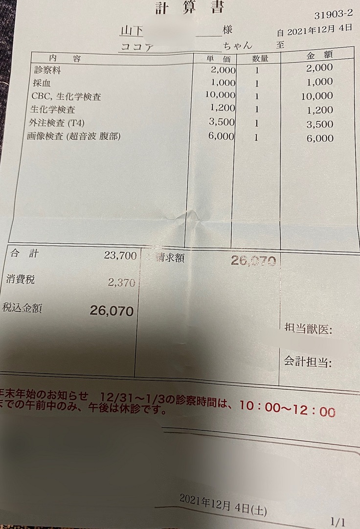 血液検査と外注に出すT4の検査で一回の通院費は約17,700円かかると思われます。(前回の診察明細より)