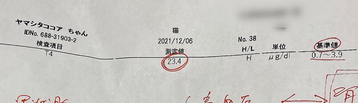 12月13日の記事に記載している通り、猫の甲状腺ホルモンT4の正常値は 0.7〜3.9μg/dl とされていますが、ココアの場合はこの数値が23.4もありました。