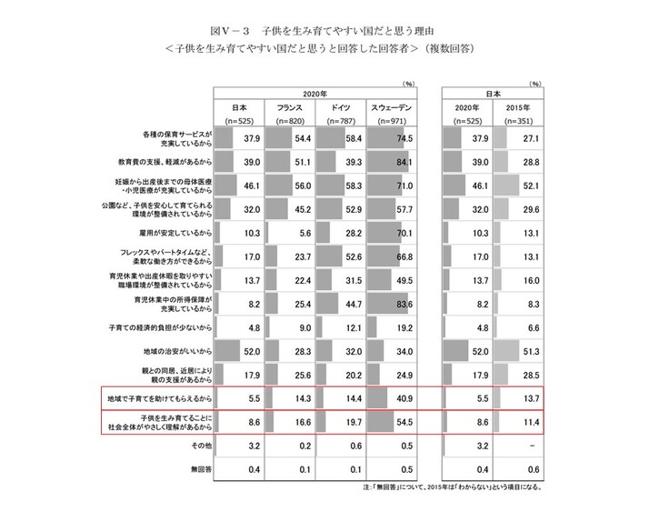 日本においては治安の良さ以外のすべての項目で他国と比べ低い回答率となっており、裏を返せば政策や社会全体の構造として特徴のない、育児への理解が低い状態であるともいえます。中でも、治安が良いにもかかわらず「地域で子育てを助けてもらえるから」や「子どもを生み育てることに社会全体がやさしく理解があるから」といった項目の回答率が低い点に私個人としては違和感を感じており、文化の変化によって改善できるポイントなのではと考えています。