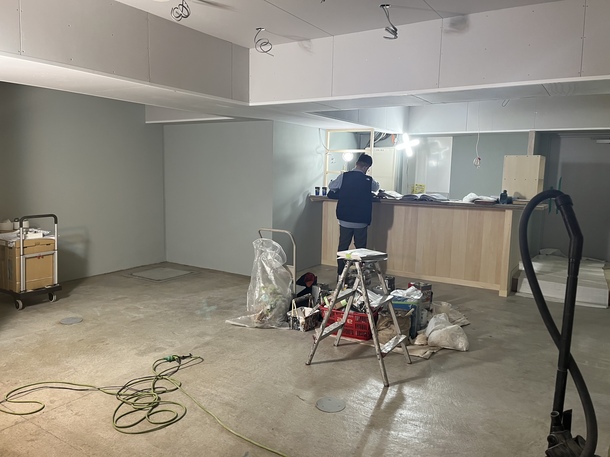 カウンターの形が出来上がり、左側の壁は落ち着いた色味のグレーに塗装が完了しました。