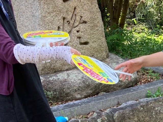 トイレトラックの周知も含めた、クラウドファンディング募集のうちわを配布しました。