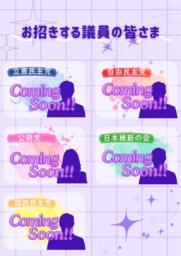 現在、各政党にて参加議員の調整を行っていただいております。登壇議員が確定次第、随時お知らせいたしますので、どうぞご期待ください!