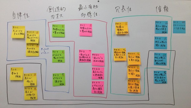 プロジェクト概要でも説明しましたが、知的創造プロセスにとって「良い場」について、経営学者 遠山氏・野中氏は5つの要素が必要であるとしています(参考: 「一橋ビジネスレビュー(2000年)」)。それは、① 自立性 ② 創造的カオス ③ 最小有効多様性 ④ 冗長性 ⑤ 愛・信頼・コミットメントです。各項目をもう少し詳しく説明すると、以下のようになります。