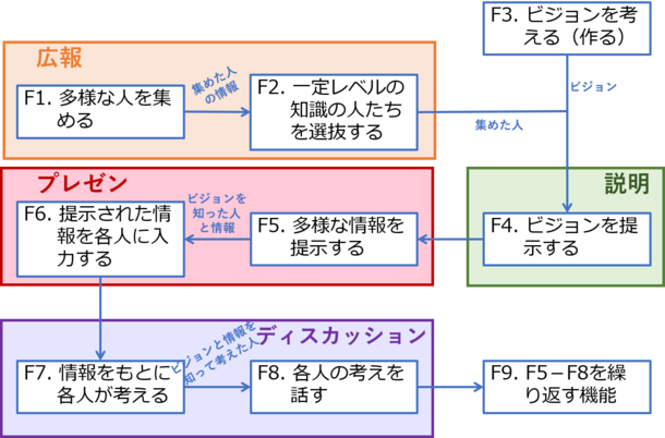 そして、列挙した必要機能を整理し、「知」の融合の場には9つの必要機能が必要であると仮説を立てました。