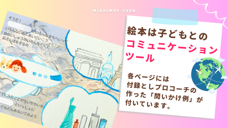 付録にはプロコーチが作った「問いかけ例」が付いています。たとえばこの絵本の中で、女の子が飛行機に乗って色々な国へ出かけます。
