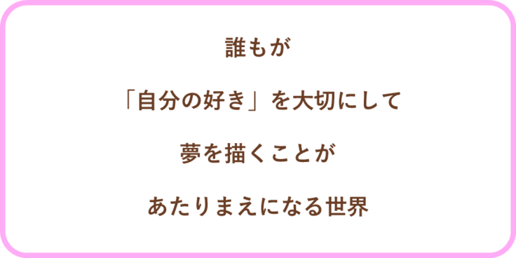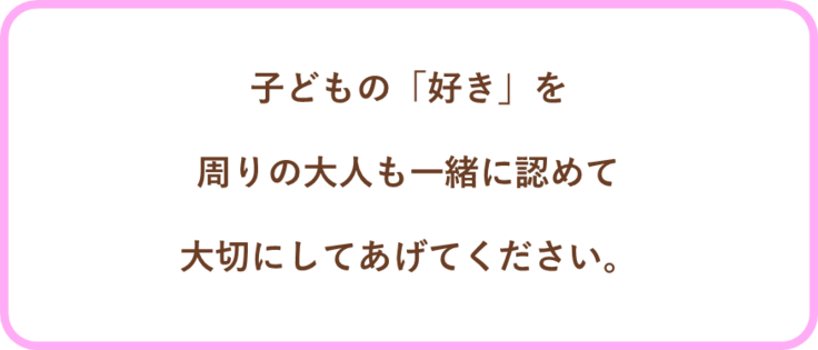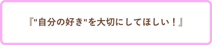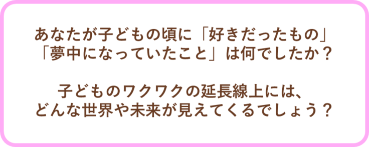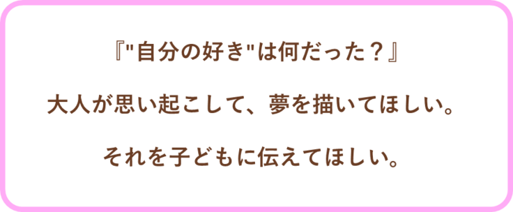 「あなたの好きなことは、とっても素敵だよ」というメッセージを、全ての子どもたちをはじめ、親御さん、教育の現場にいる方々にも届けることの必要性を感じています。