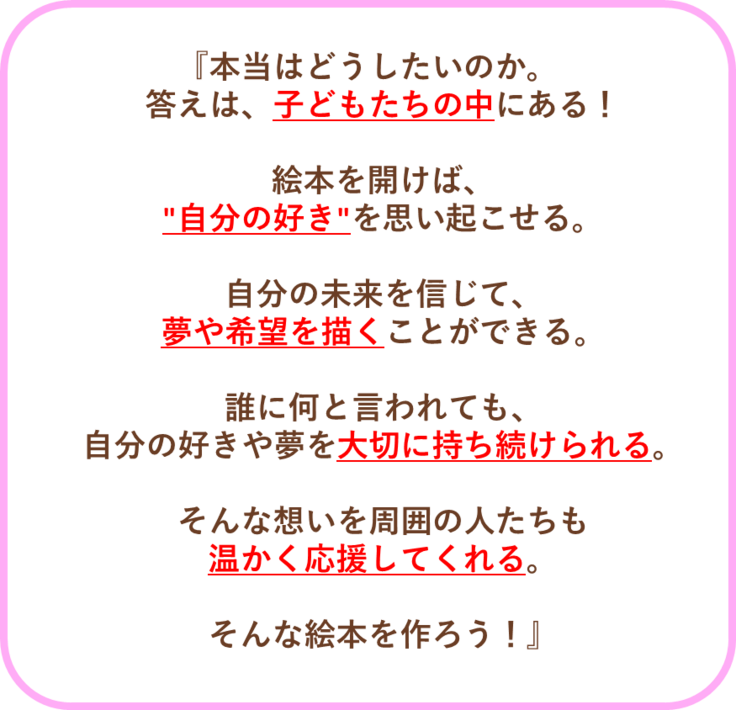 ご家庭で、保育施設で、地域で、子どもたちがこの絵本を開きながら、ワクワク夢を描く姿が見たい。一緒に遊ぶお友達の夢を応援できる、やさしい世界を作りたい。
