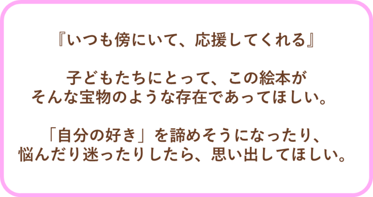 とお子さんの好きを認めてあげてほしいのです。この絵本がそんなコミュニケーションのきっかけになることを願っています。