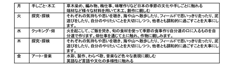 季節の手仕事を通して日本の文化や伝統を味わう日。自分のしたいことをとことん味わい、探究する日。火おこしから始めて自分たちの食べるものを自分たちの手でつくり出す日。自然に一歩踏み込んで自分の限界より半歩先に挑戦してみる日。手を動かしものを作ったり、気持ちの有り様を表現したり、心で音を感じる、わらべ歌を味わう日など...そうした一つ一つがこども達の原風景になり、自分を作る土台、生きる力となっています。また、失敗も成功も共に味わい喜ぶ。不思議だと思ったことを考え、素直に語り合える。自然に感謝し、自然に感動することなど、守られているという安心感の元で色々なことにチャレンジできるように、こどもたちとの関係づくりを大切にしています。