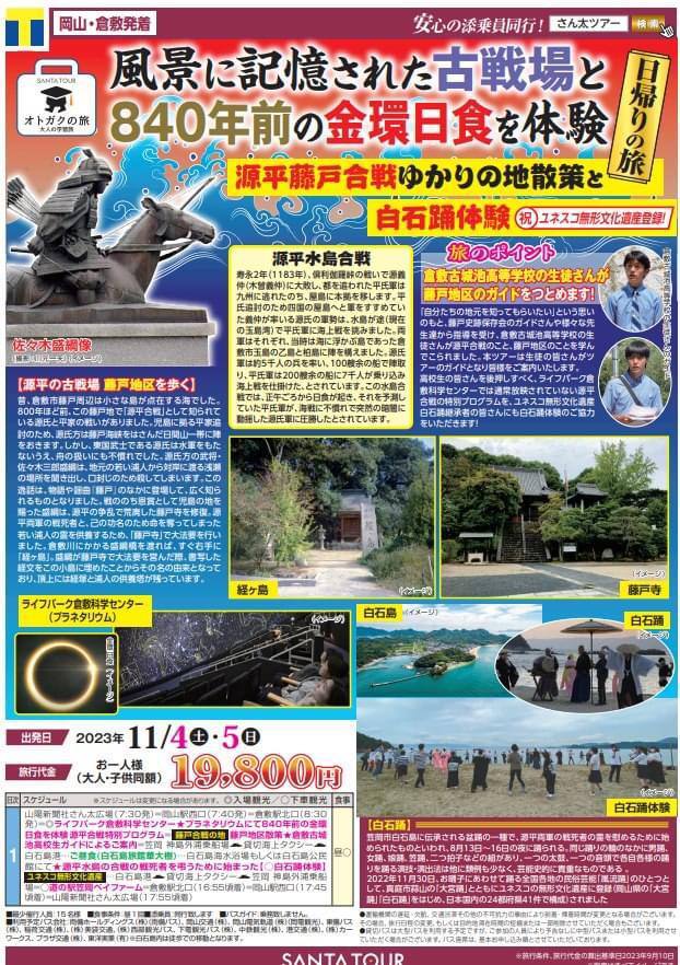 岡山・倉敷発着「風景に記憶された古戦場と840年前の金環日食を体験 源平藤戸合戦ゆかりの地散策と白石踊体験 日帰りの旅」