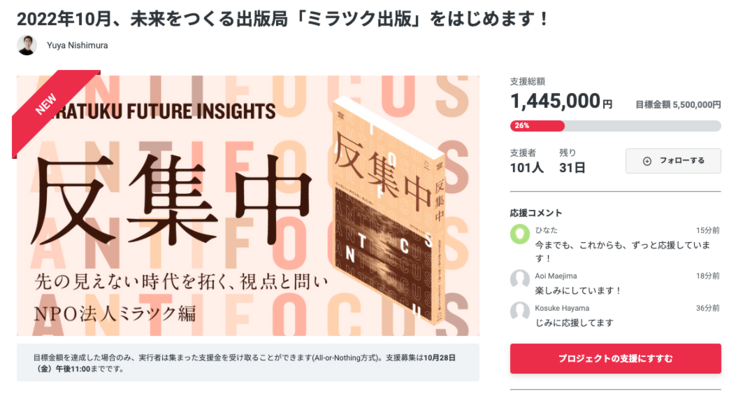 やっぱり、最初が一番怖いので、そこに積み重なるように支援とコメントが入ってくる、というのはとても心がやすらぎます。