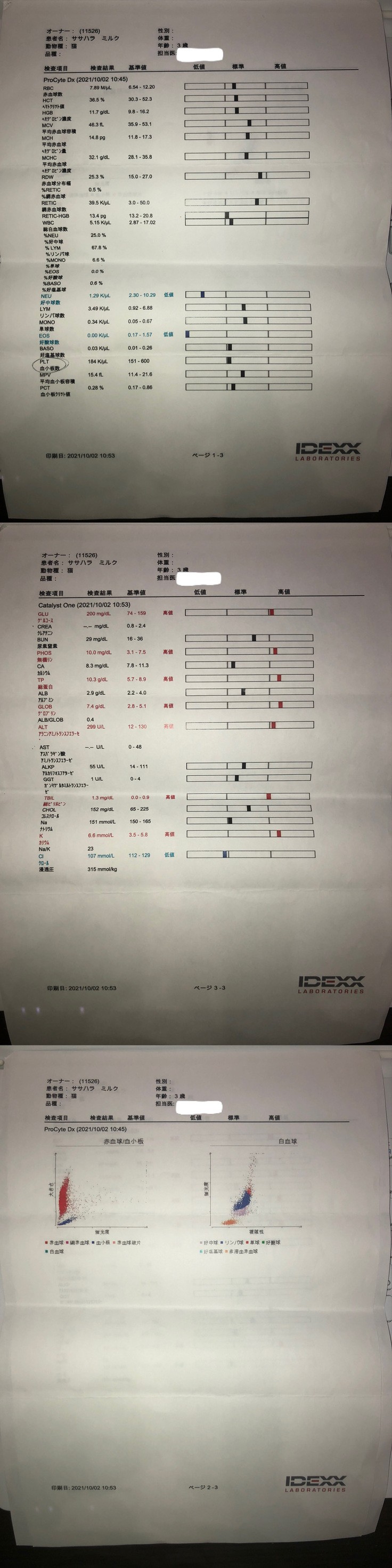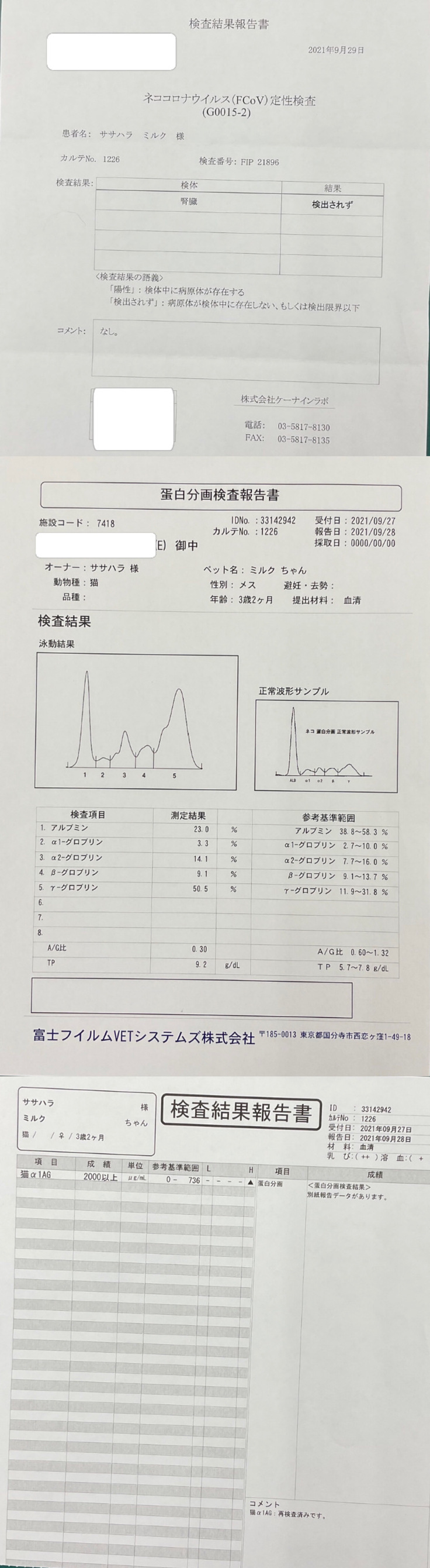 ただ、血液検査の結果とグロブリンの数値、蛋白分画検査、眼のぶどう膜炎もあり、FIP(猫伝染性腹膜)で間違いないです。とのことでした。