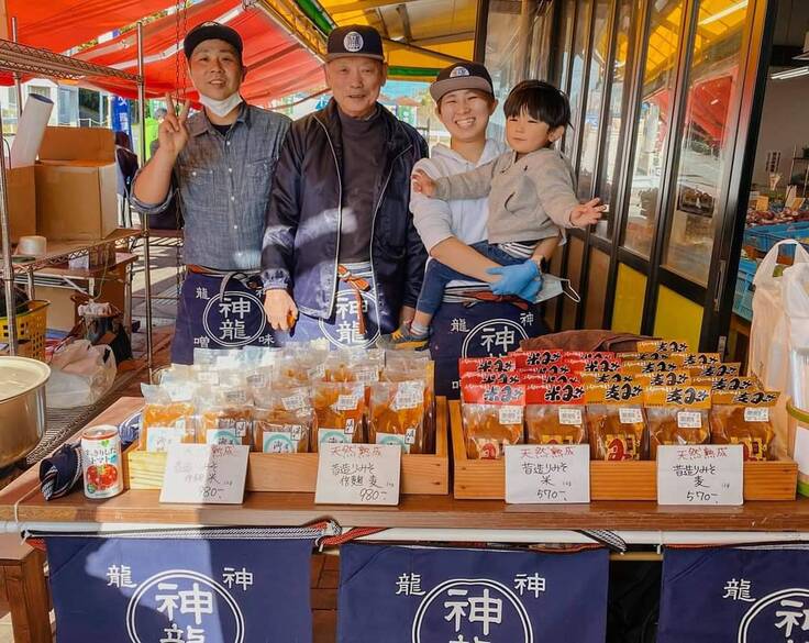 移住した当初はまさか味噌蔵を継ぐことになるとは思っていませんでしたが、主人が5年前に神龍味噌でアルバイトをしていたことがきっかけになり先代から声を掛けていただき2020年11月1日に2代目から3代目に事業継承をさせていただきました。