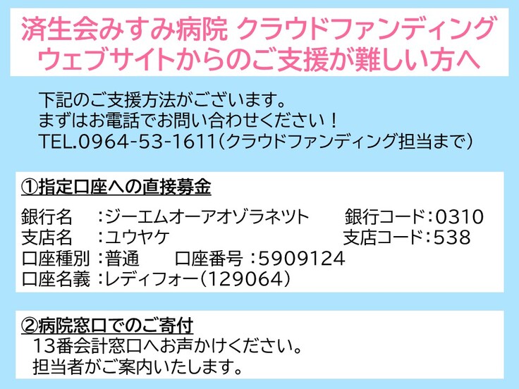 ※寄付金領収書は、2024年4月末までに送付予定でございます。領収書の日付は、みすみ病院へ入金される2024年3月の日付になります。このため、2024年の所得に対する確定申告の対象となりますので、ご注意ください。