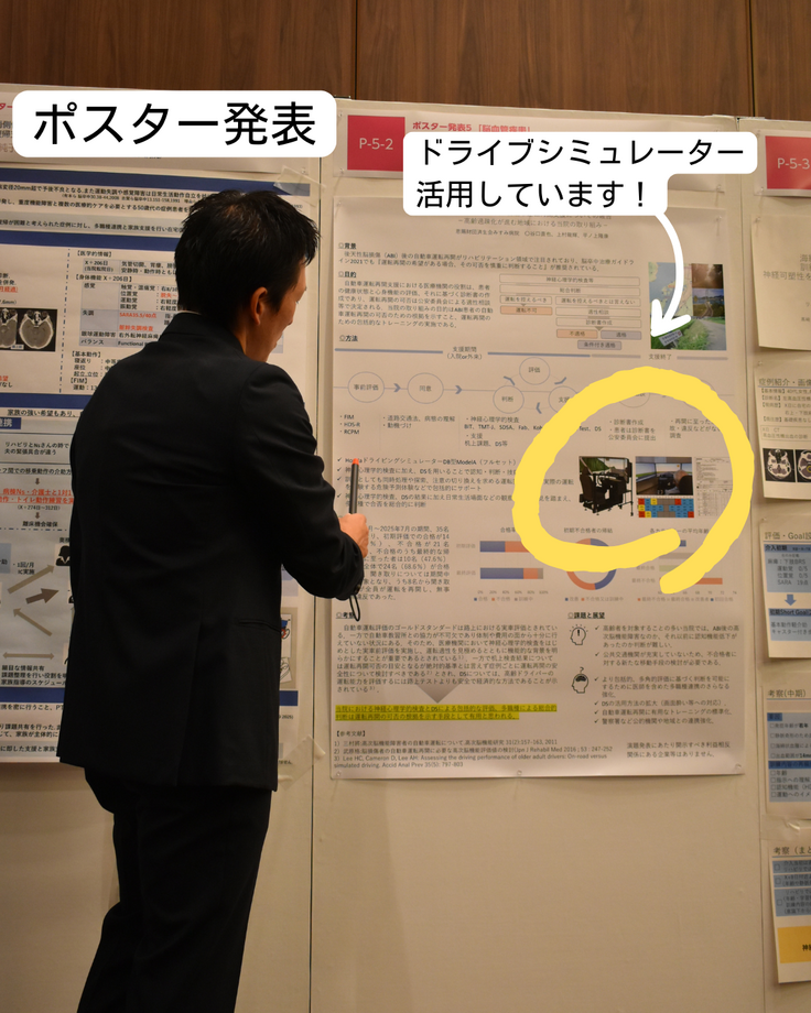 今回、当院からも4名が発表を行いました。その中には「自動車運転再開支援」についての報告もあり、多くの方に当院の取り組みを紹介することができました。ドライブシミュレーターの活用については、興味を持たれる方も多く、質問も多数いただいたようです。