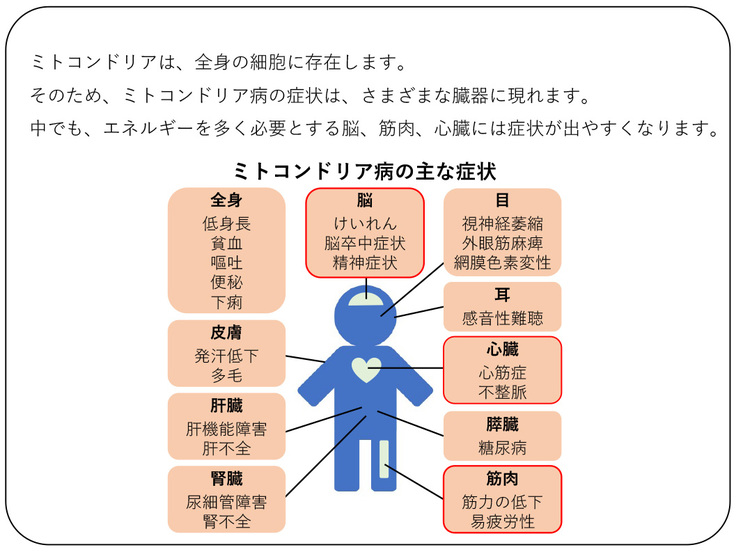 ●ミトコンドリアは、全身の細胞に存在します。そのため、ミトコンドリア病の症状は全身のさまざまな臓器に現れます。中でも、エネルギーを多く消費する脳や骨格筋、心臓には症状がでやすいのです。