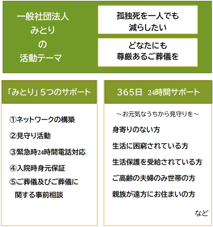 「一般社団法人みとり」は社会問題にもなっている「孤独死」を、一人でも減らしたい、そして身寄りのない方・生活に困窮されている方に「尊厳あるご葬儀を」という想いで、2022年2月より、大阪府下を中心に活動をしています。