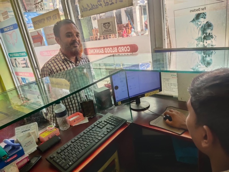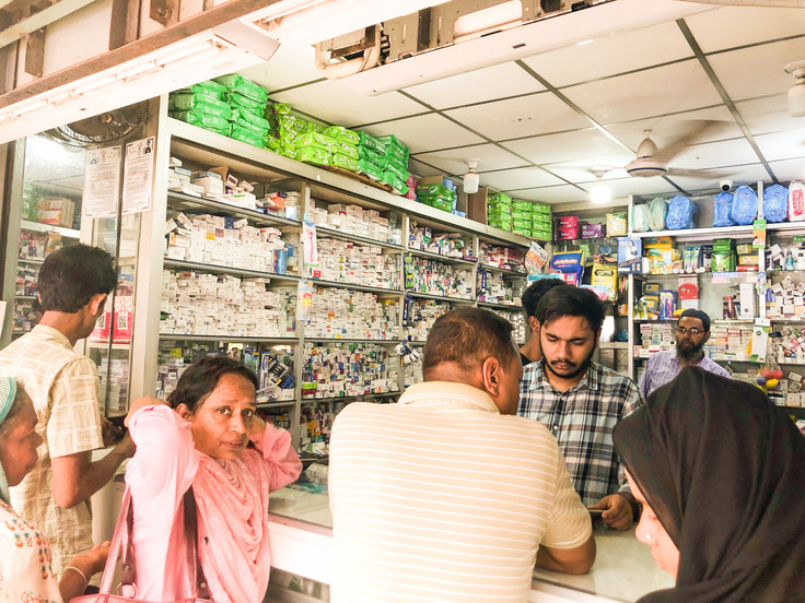 バングラデシュでは、慣習的に医師の処方箋がなくても薬局スタッフに症状を相談することで薬の販売や処置アドバイスをもらうという慣習が一般化していますが、本来十分な医療教育を受けていないとならない薬局スタッフにもかかわらず、全国約22万件ある薬局のうち約10万件はライセンスを持たない政府非認可薬局(違法薬局)*1, 2であり、これら政府非認可薬局は、適正な医療教育を受けていない人々によって運営されています。(10万人当たりの薬剤師数は日本の1/40 *3)このため、薬局での診療(的)行為の質は低く、抗生剤の不適切使用など薬局で誤った薬を処方されるリスクが高まっています。また、重症化する可能性のある疾患を持つ人々が、医療機関への受診をせずに病気が重篤化するケースも多く存在しています。